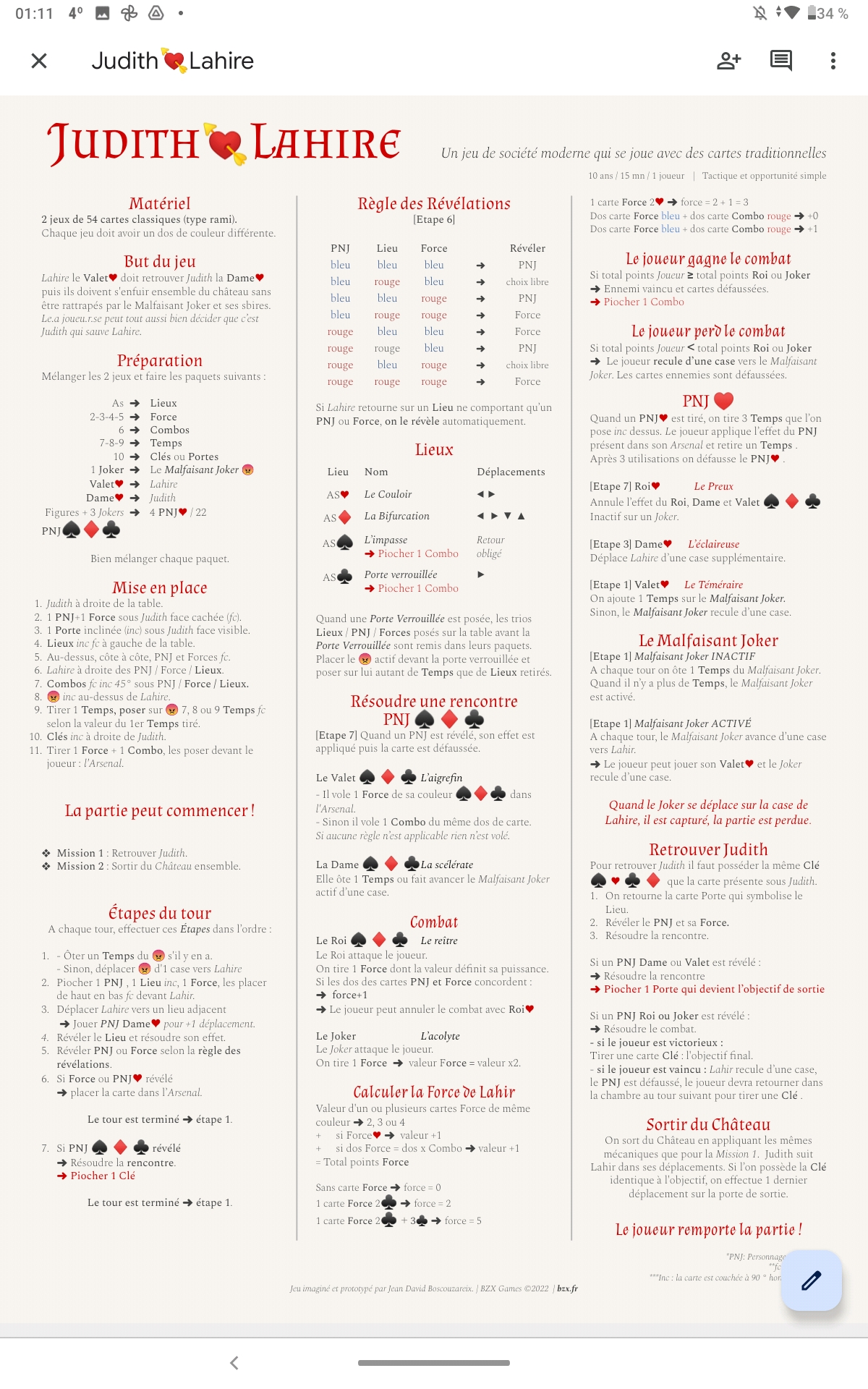 Judith 💘 Lahir est né du besoin de tester une mécanique de jeu rapidement et sans prototypage préalable. Il s’agit d’un jeu de société moderne qui se joue avec 2 paquets de 52 cartes. Incarnez Judith ou Lahir et retrouvez votre bien aimé.e détenu.e par le Malfaisant Joker. Vous devrez trouver votre chemin dans le château, affronter les sbires du Joker, délivrer votre aimé.e et trouver la sortie avant d’être capturé. Un jeu solo qui combine tirage et opportunité pour des parties de 20mn.